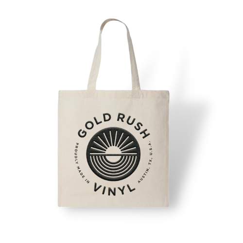 100% natural-colored cotton tote bag with our screen-printed logo. 15" (W) x 16" (H) perfect for carrying your new purchased records out of the store in style.